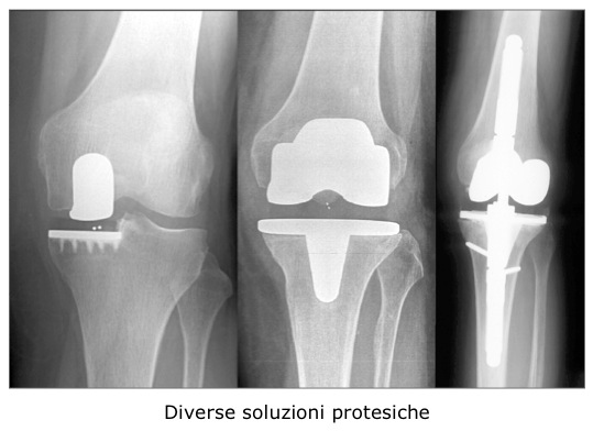 Tra le soluzioni proposte esistono protesi totali, dove tutta l’articolazione viene sostituita, o protesi monocompartimentali dove invece si sostituisce soltanto “metà” articolazione. Quanto ai materiali di cui sono composte le protesi, distinguiamo per semplicità protesi non cementate, ovvero ad ancoraggio diretto osso-protesi, e protesi cementate, legate all’osso mediante cemento acrilico.